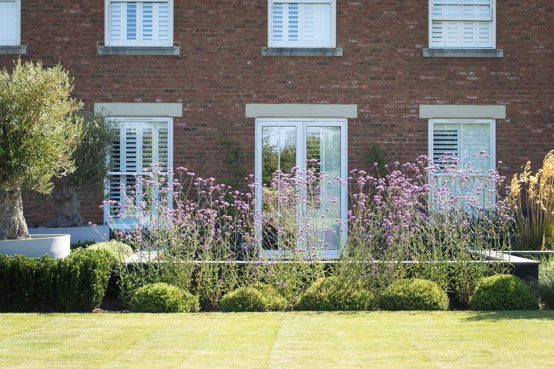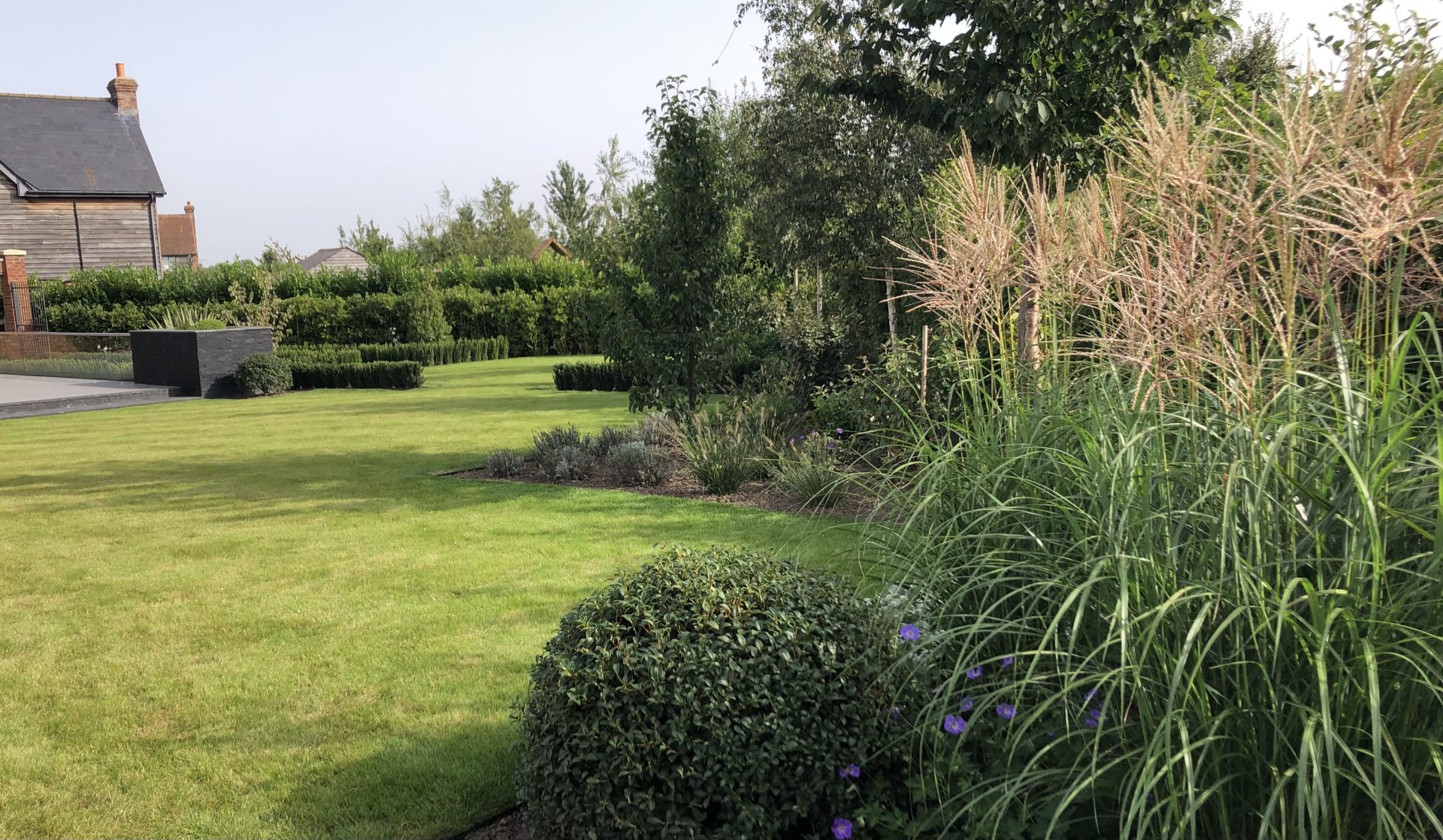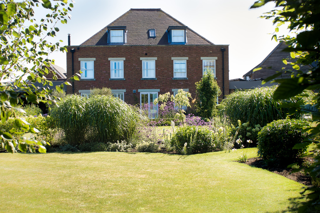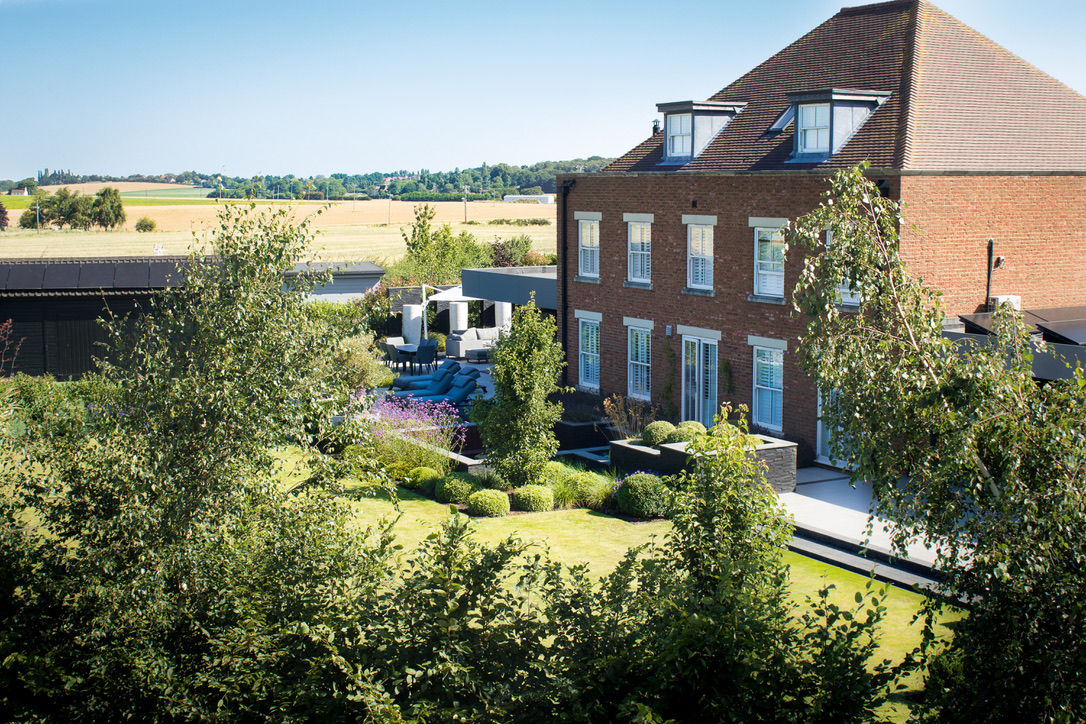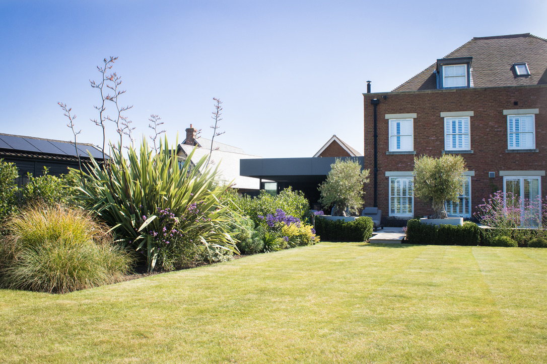 This new build Manor House was a blank canvas, dominated by an outbuilding and artificial putting green which required screening from the rest of the garden. A patio and sunken firepit had already been built but the area needed some softening. With a modern extension about to be built the clients asked for a new entertaining area which created a great view from inside the house, was screened from the neighbours and sheltered from the strong winds.