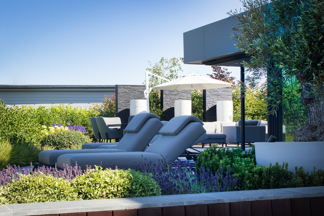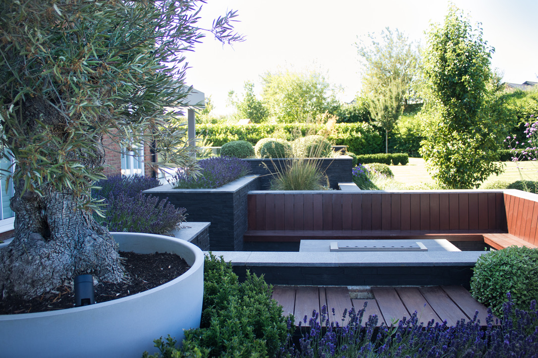 A series of square, formal lawns form the main area of the garden to mirror the straight lines of the house, with a series of curving paths leading away from the lawn to create different areas and destinations. The existing raised planters and sunken firepit were reclad in stone to replace the render which was already failing in places. A dark colour was chosen so the hard elements would recede and became a background to the planting.