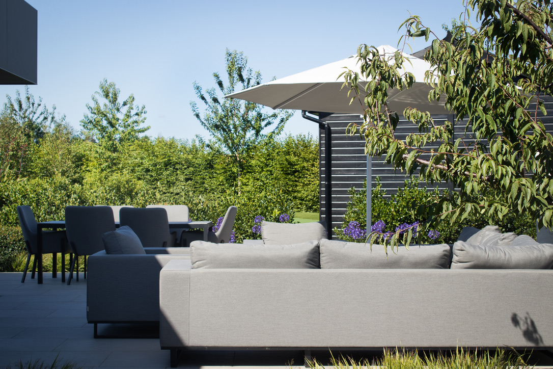 An evergreen hedge was used to screen the putting green from the rest of the garden as well as the low boundary fence to the side of the house giving year round greenery and a real sense of enclosure to the new seating area where three beautiful statement pots from Torc Pots are set in front of textured wall panels.e A lightly textured grey porcelain was chosen for the new patio and to replace the riven sandstone to create a scheme which ties the old and new styles of the house together and gives a high end finish.