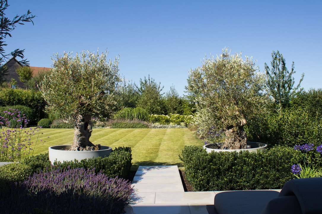 The client asked for simple planting with texture and form for impact rather than lots of bright, high maintenance flower colour. Their existing Olive trees were used to create more enclosure around the patio and a series of multi stem Ornamental Pear trees were placed around the lawn for spring blossom and autumn leaf colour. Uplighters on the trees and pots extend the interest into the evening as well as from Summer to Winter. Classic evergreen balls, low formal hedging and shrubs chosen for leaf colour and shape were softened with varioius grasses and some perennial groundcover plants for just a smattering of colour. Taps and irrigation were installed around the garden, an important consideration for the establishment of the plants in such a large area open to drying winds.